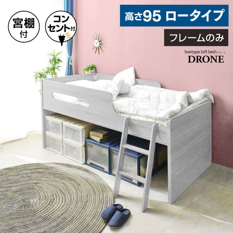 ロフトベッド ロータイプ 子供 木製 最安挑戦 高さ95 宮付き 棚付き コンセント すのこベッド 大人 用 白 ドローン フレームのみ / ホワイト / -ART
