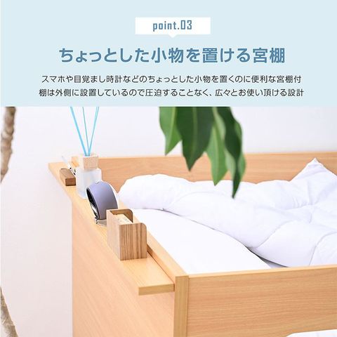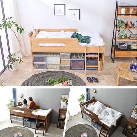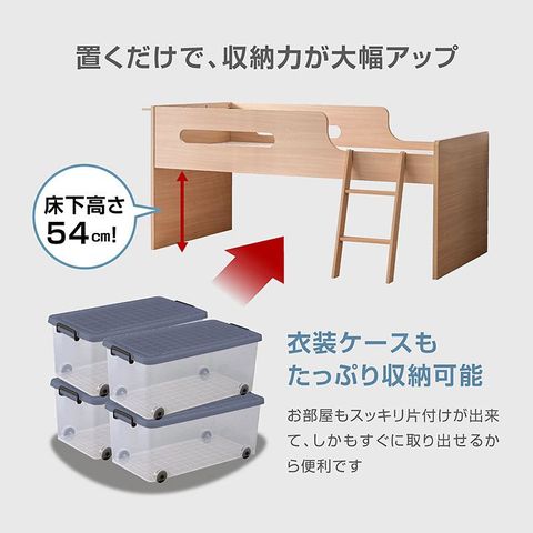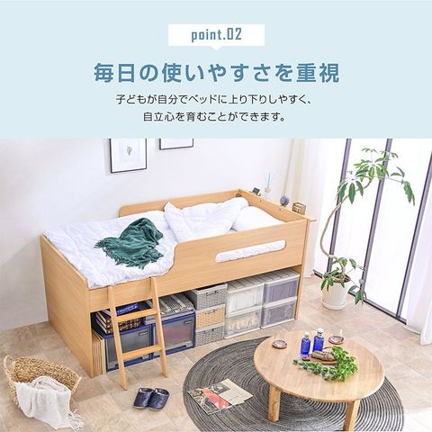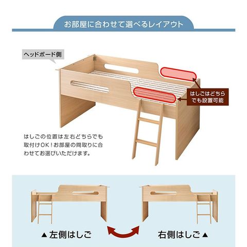 \収納力抜群!ロフトベッド/ ・たっぷり収納!ベッド下部を有効に使えます ・高さを抑えた95cmのミドルタイプ ・宮棚、2口コンセント付き ・広い入口で大人の方も出入りがラクラク ・低く安定したハシゴでお子様も楽々上り下り ・ハシゴの位置が左右どちらでも変更できます ・高めのサイドフレームで布団などの落下防止 ・さらりとした手触りで木のぬくもりを感じられる木目調 ・オールシーズン快適なスノコ床板 ・小さなお子様から大人でも安心してお使い頂けます |