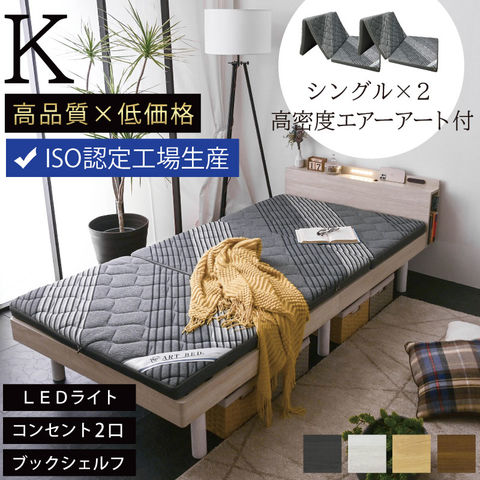 シングル2台 ベッド すのこベッド LED照明 宮付き 高さ調節 コンセント付 木製 ベット ローベッド ロマン / ホワイト / (三つ折りマットレス エア アート2枚付) -ART