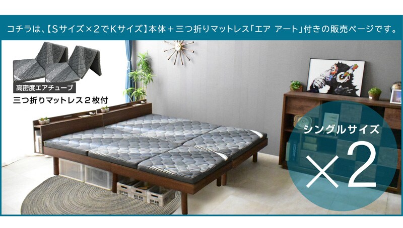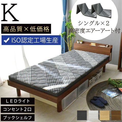 シングル2台 ベッド すのこベッド LED照明 宮付き 高さ調節 コンセント付 木製 ベット ローベッド ロマン / ウォールナット / (三つ折りマットレス エア アート2枚付) -ART