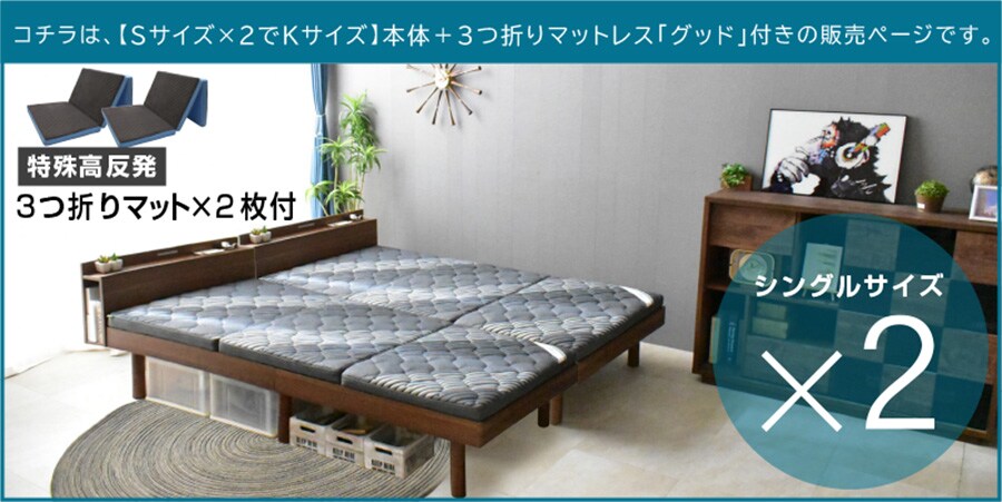 シングル2台 ベッド すのこベッド LED照明 宮付き 高さ調節 コンセント付 木製 ベット ローベッド ロマン / ウォールナット / (特殊高反発三つ折りマット2枚付) -ART
