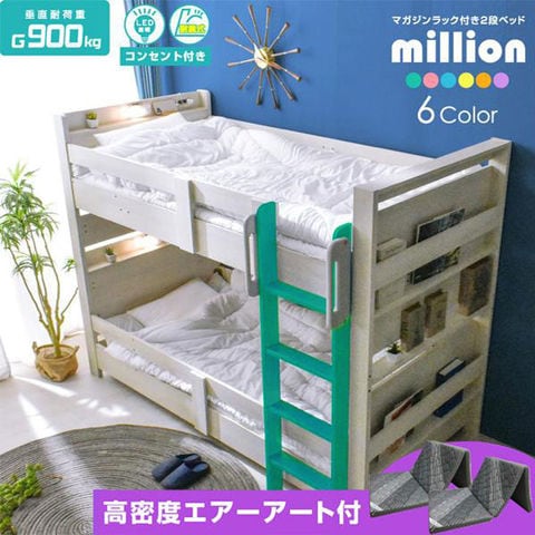 二段ベッド 2段ベッド 耐震式 耐震900kg 大人用 子供 コンセント付き ライト付き シングルベッド 限定品 ミリオン / ペパーミントグリーン / (三つ折りマットレス エアアート2枚付) -ART