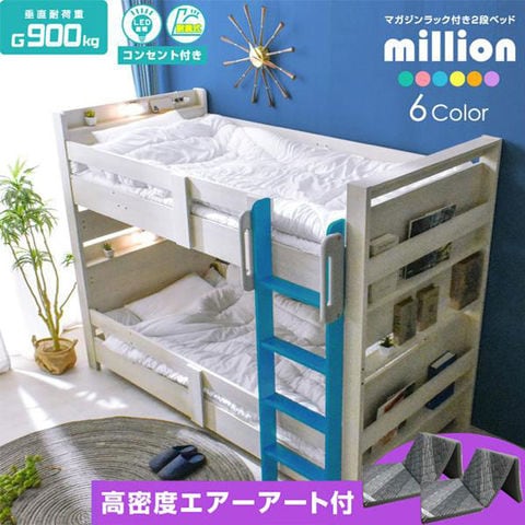 二段ベッド 2段ベッド 耐震式 耐震900kg 大人用 子供 コンセント付き ライト付き シングルベッド 限定品 ミリオン / アイスブルー / (三つ折りマットレス エアアート2枚付) -ART