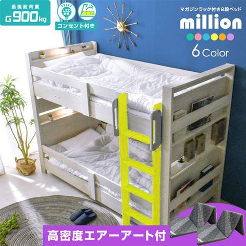 二段ベッド 2段ベッド 耐震式 耐震900kg 大人用 子供 コンセント付き ライト付き シングルベッド 限定品 ミリオン / レモンイエロー / (三つ折りマットレス エアアート2枚付) -ART