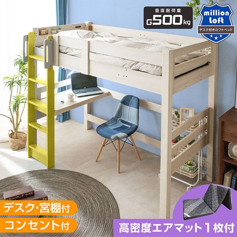 ロフトベッド ハイタイプ 木製 子供 大人用 シングル デスク付 取っ手付 宮付き コンセント付 ベッド ミリオンロフト / レモンイエロー / (エアーアート付) -ART