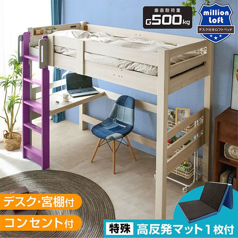 ロフトベッド ハイタイプ 木製 子供 大人用 シングル デスク付 取っ手付 宮付き コンセント付 ベッド ミリオンロフト / ラベンダー / (特殊高反発三つ折りマットレス付き) -ART