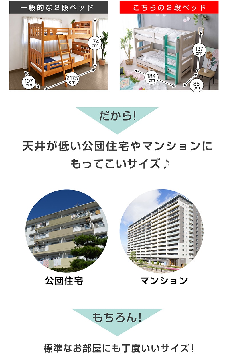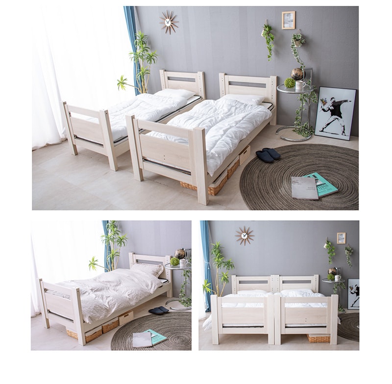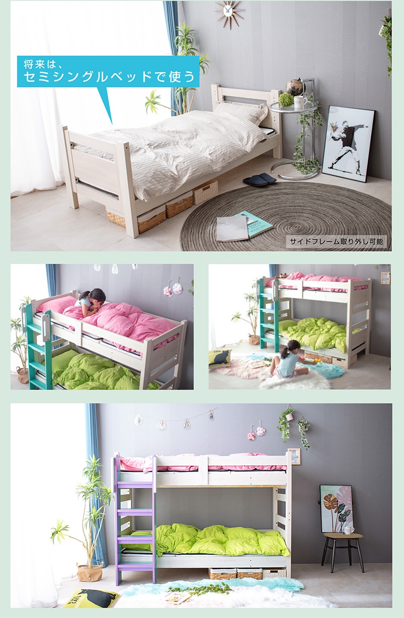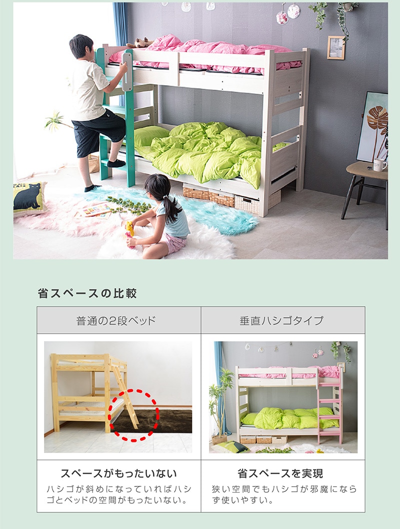 \自分好みに選べるカラー全6色/ ・左右のベッドの高さが同じフラット設計 ・お子様が小さいうちはクイーンベッドとして、兄弟仲良く話して使うことも可能 ・上段に縦の補強板を追加して強度をアップ! ・上段と下段のつなぎ目を固定することで縦ブレをなくし、開き止めで横ブレを防ぐ ・ハシゴをビス止めでガッチリ固定でぐらつきなし ・省スペースを実現する垂直ハシゴタイプ ・ハシゴには丈夫な手掛け付きだから安心して昇り降りができる ・すのこ床板でオールシーズン快適 |