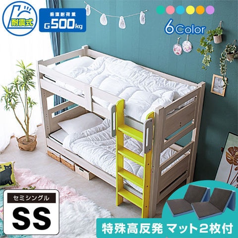 二段ベッド 2段ベッド コンパクト セミシングル 他社に徹底対抗 耐震式 耐荷重500kg クイーン対応 SSミリオン / レモンイエロー / (特殊 高反発三つ折りマットレス2枚付) -ART