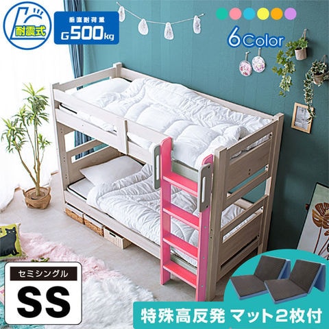 二段ベッド 2段ベッド コンパクト セミシングル 他社に徹底対抗 耐震式 耐荷重500kg クイーン対応 SSミリオン / ローズピンク / (特殊 高反発三つ折りマットレス2枚付) -ART