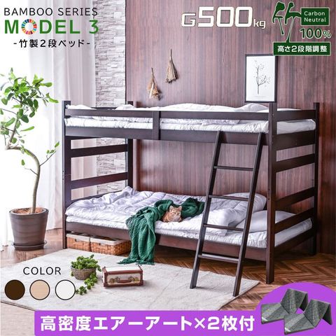 グラつかない 二段ベッド 2段ベッド 天然木 竹製 大人用 子供 耐荷重500kg シングル&キング対応 高さ調節 SDGs 持続可能 モデル3 / ウォールナット / (三つ折りマット エアアート2枚付) -ART
