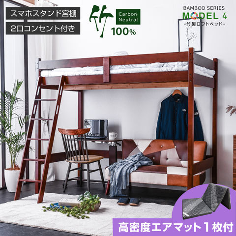 グラつかない ロフトベッド ベッド ベッドフレーム 竹製 天然木 エコ素材 宮棚付 2口コンセント付き スマホスタンド SDGs モデル4 / ウォールナット / (高密度三折りマットエアアート付) -ART