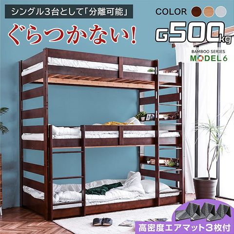 グラつかない 三段ベッド 3段ベッド シングル対応 天然木 竹製 耐震式 500kg コンセント付 LED照明付 ロータイプ 分離 モデル6 / ウォールナット / (三つ折りエアアート×3枚付) -ART