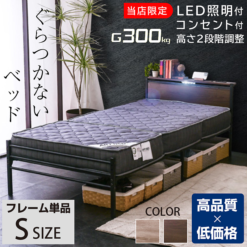 ぐらつかない ベッド ベッドフレーム シングルベッド スチールベッド 宮棚 LED照明付 コンセント付 耐荷重300kg 2段階高さ調整 ムーンZ / ウォールナット×ブラック / -ART