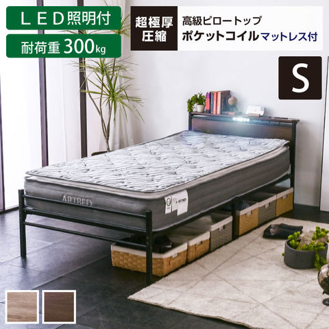 ぐらつかない ベッド ベッドフレーム シングルベッド スチールベッド 宮棚 LED照明付 コンセント付 耐荷重300kg 2段階高さ調整 ムーンZ / ウォールナット×ブラック / (高級ピロートップポケットマット付) -ART