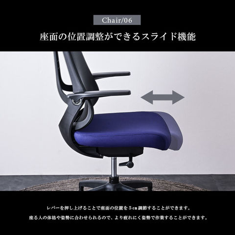 | 特徴 | ・背ハイバック ・座面スライド機能(約5cm) ・シンクロロッキング角度固定 4ポジションロック ・アームレスト付き 90度 ・ナイロンキャスター ・ガスシリンダー座面高調節(約9cm) |