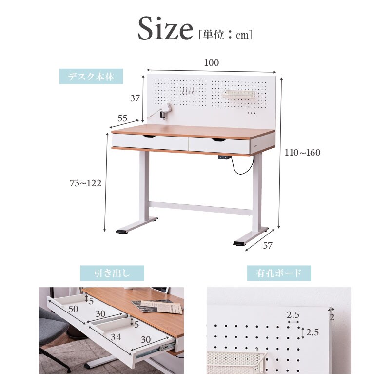 | サイズ(cm) | 幅100×奥行き57×高さ110(73) 【上昇時】幅100×奥行き57×高さ160(122) 【天板(引き出し含)】幅100×奥行き55×高さ1.5(12.5) 【有効ボード】幅100×奥行き2×高さ37 【引き出し(大)】幅50×奥行き30×高さ5 【引き出し(小)】幅34×奥行き30×高さ5 |