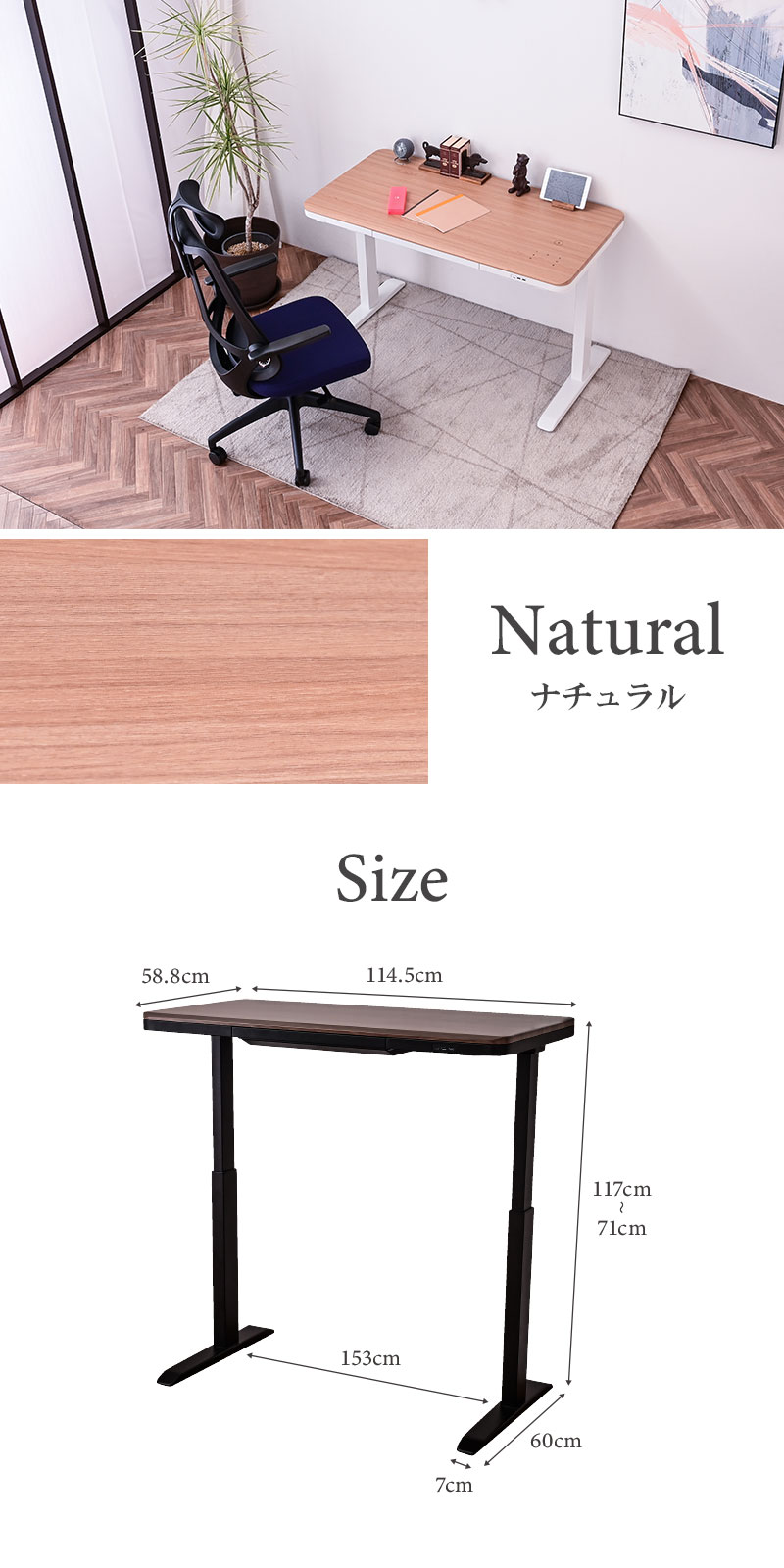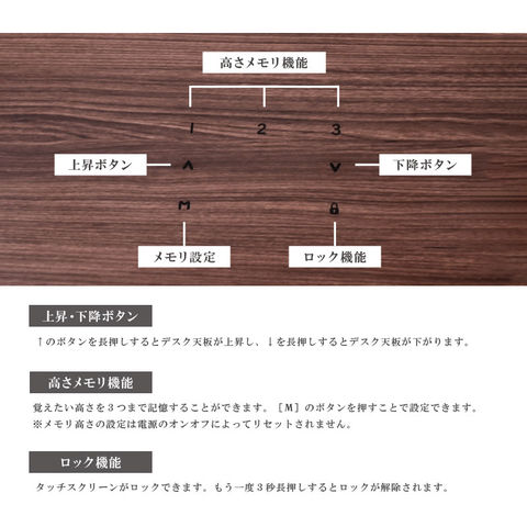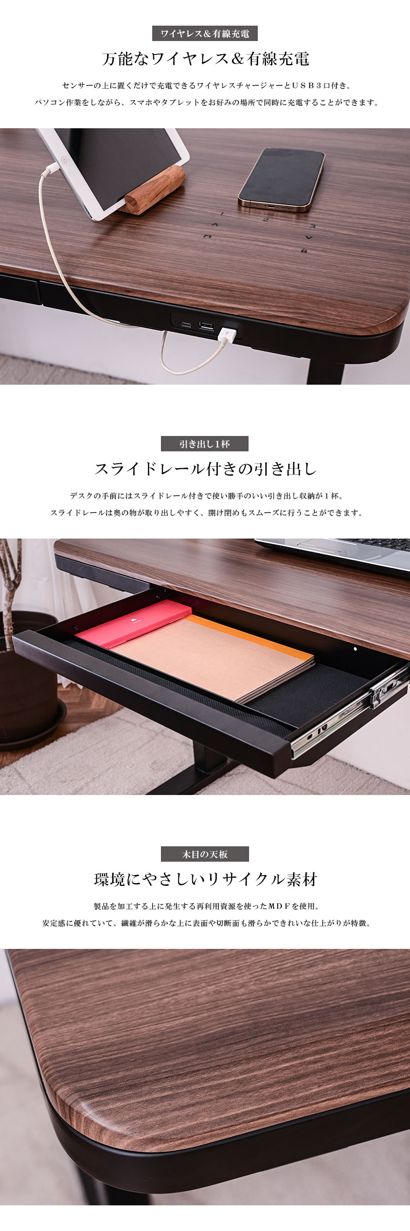| 特徴 | ・タッチパネル&メモリ機能で簡単昇降 ・障害物検知機能付きで安心 ・場所を取らないコンパクトサイズ ・万能なワイヤレス&有線充電 ・スライドレール付きの引き出し ・環境にやさしいリサイクル素材(MDF)使用 ・デスク周りは角丸加工で腕を長時間置いて疲れにくい ・アジャスター付きのスチール脚 |