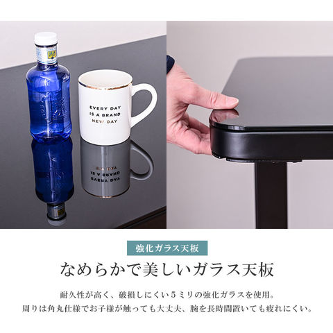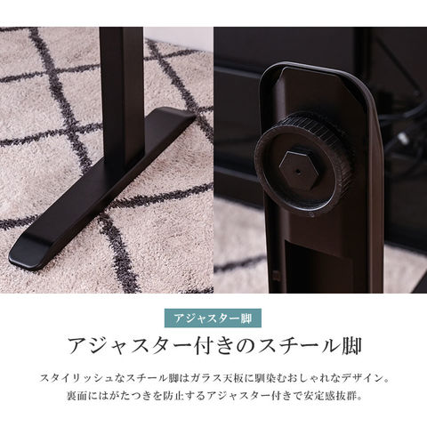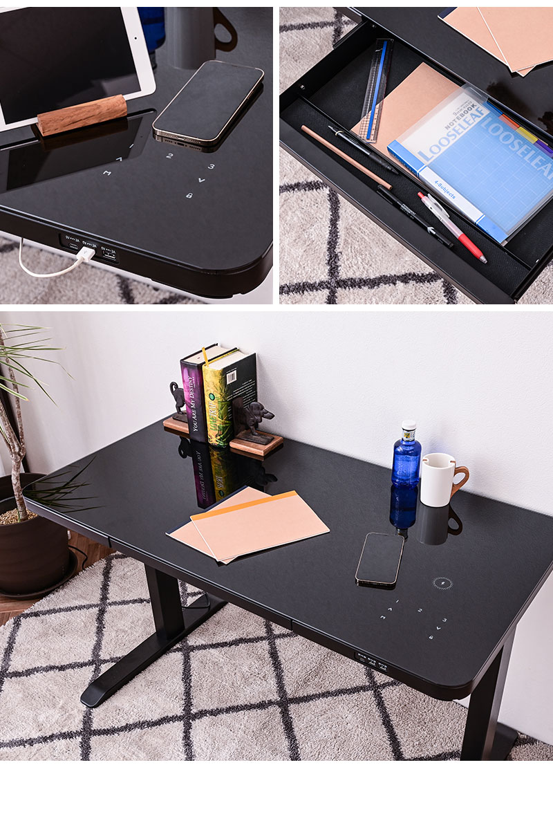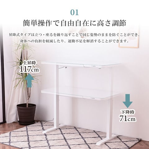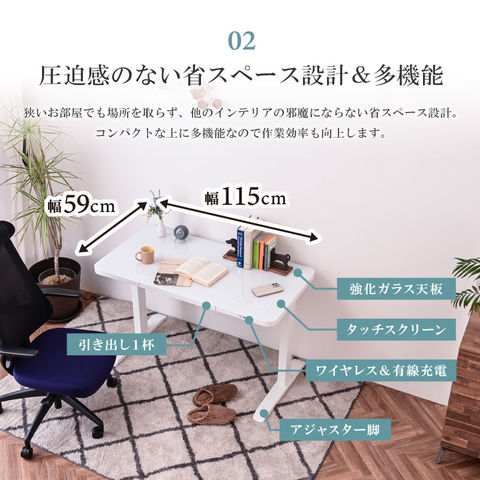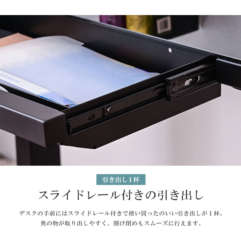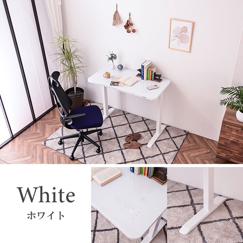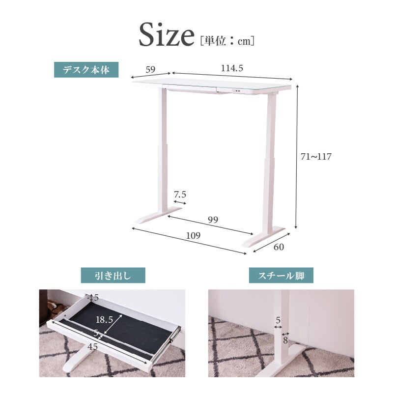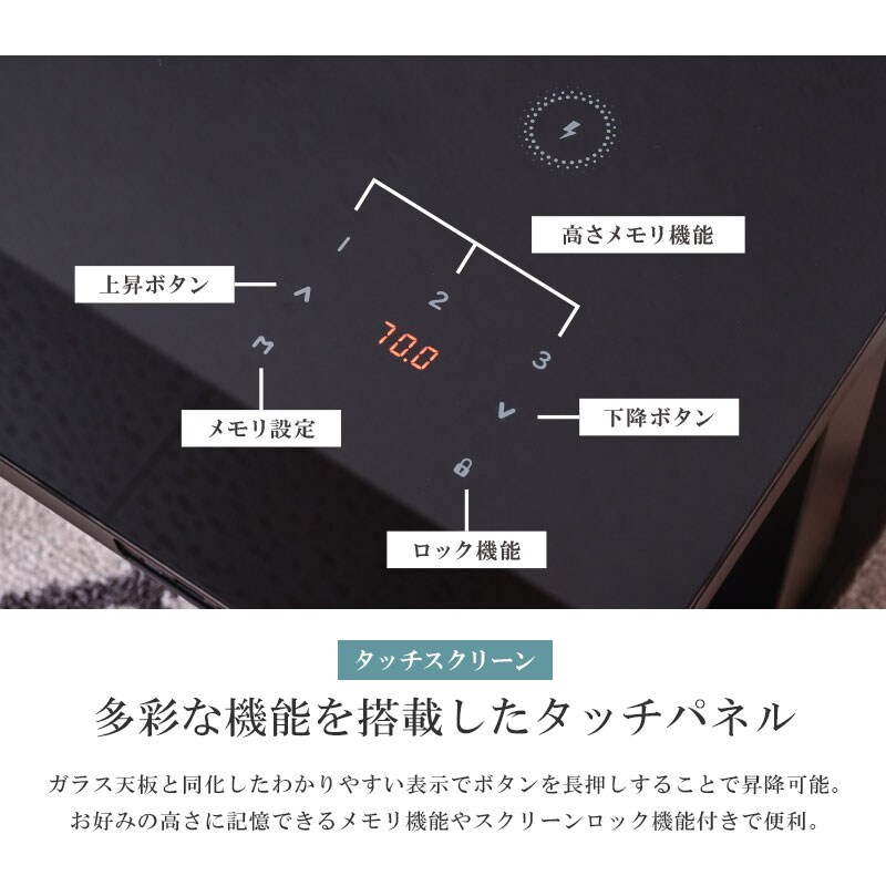 | 特徴 | ・簡単操作で自由自在に高さ調節(上昇時:117cm 下降時:71cm) ・狭いお部屋でも場所を取らず、圧迫感のない省スペース設計&多機能 ・なめらかで美しいガラス天板は耐久性が高く、破損しにくい ・多彩な機能を搭載したタッチパネル(セキュリティロック機能、3メモリ記憶) ・万能なワイヤレス&有線充電(USB2ポート、typeC) ・スライドレール付きの引き出しで奥の物が取りやすく、開け閉めスムーズ ・アジャスター付きのスチール脚はガラス天板に馴染むおしゃれなデザイン |