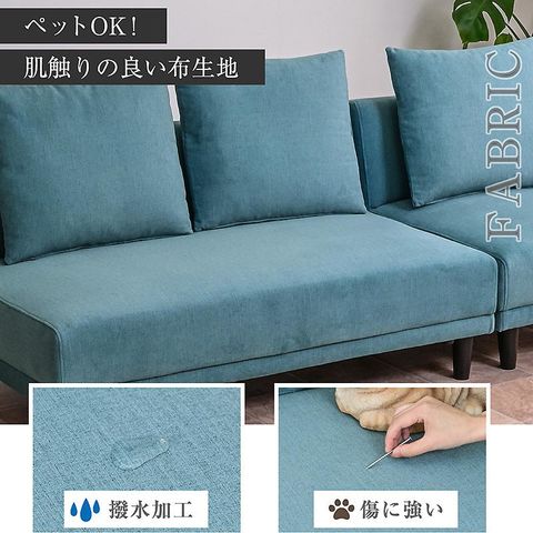 ・2つのソファはリクライニング、展開、分割の異なる4通りの使い方が可能(3人掛けソファ、ソファベッド、カウチソファ、2台のソファ) ・3段階のリクライニング機能でシーンに合わせてフラットスタイルに ・ソファベッドとして使うことができ、背中に隙間が当たりません ・座面は複数人が同時に座れる広さがあり、あぐらをかいて座ることもできます ・クッションはふかふかで快適、座面はウレタンフォームで程よい硬さに ・柔らかい手触りとなめらかなドレープ感が特徴のベロア生地は傷に強く、撥水加工で汚れにくい ・落ち着いた印象の黒豆脚とアースカラー生地でよりナチュラルな印象に ・脚の高さは程よく、掃除機が入りやすい ・脚を外してローソファやローベッドにもなり、小さなお子様がいるご家庭でも安心 |