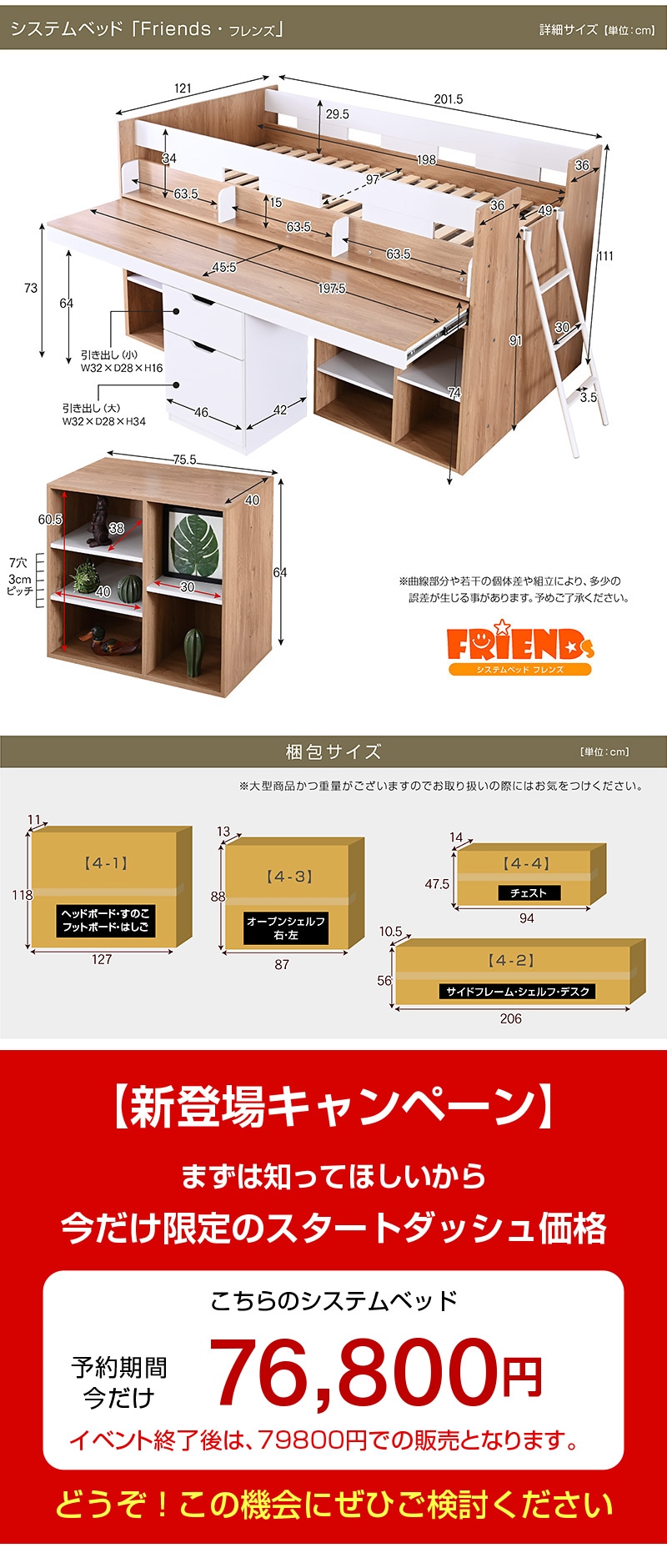 | 梱包サイズ | 【4-1(ヘッド・フット、すのこ、はしご)】127×118×11(cm) 【4-2(サイドフレーム)】206×56×10.5(cm) 、【4-3(オープンシェルフ左右)】87×88×13(cm) 【4-4(チェスト)】94×47.5×14(cm) |