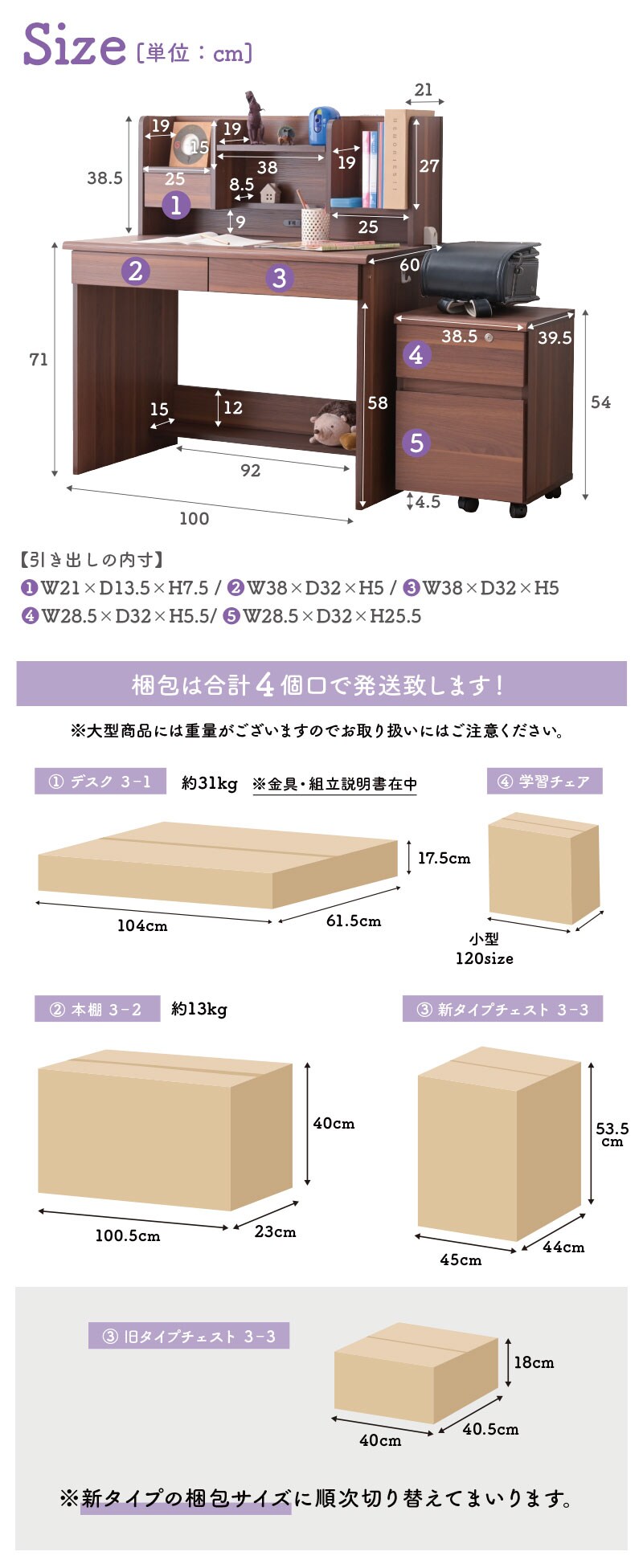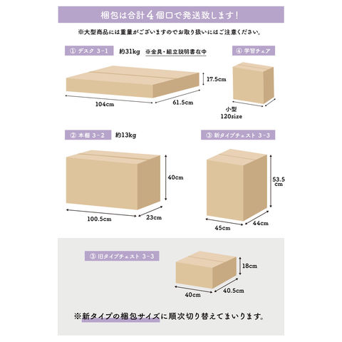 【デスク】幅104×奥行き61.5×高さ17.5(約31kg) 【本棚】幅100.5×奥行き23×高さ40(約13kg) 【旧チェスト】幅51×奥行き42×高さ22(約18kg) 【新チェスト】幅45×奥行き44×高さ53.5 ※新タイプの梱包サイズに順次切り替えてまいります。 |