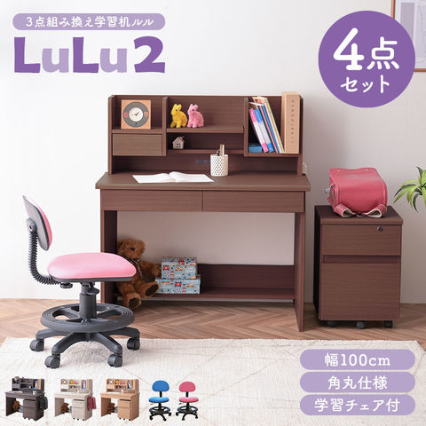 学習机4点セット 学習チェア付き 学習デスク 幅100cm 角丸 コンパクト 省スペース デスク 学習椅子 デスクチェア 木目 組み換え ルル2 / デスク:ウォールナット / チェア:ピンク / -ART
