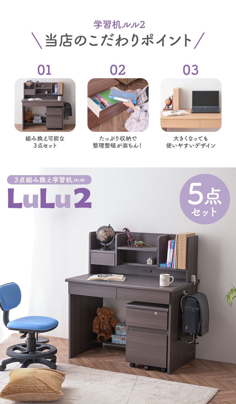 | 特徴 | 【デスク】 ・幅100cmの広々スペース ・角丸仕様でお子様も安心 ・デスク下にも収納スペース 【本棚】 ・3段階可動棚 ・デスクライト置き場 ・2口コンセント 【チェスト】 ・すっきりなライン取っ手 ・ストッパー付きキャスター ・開け閉め楽々なスライドレール ・高さのあるチェスト下段収納 |