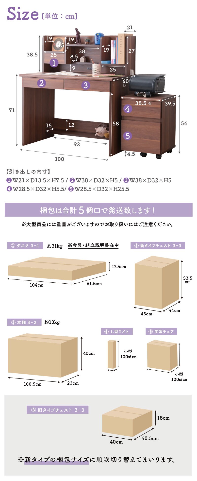【デスク】幅104×奥行き61.5×高さ17.5(約31kg) 【本棚】幅100.5×奥行き23×高さ40(約13kg) 【旧チェスト】幅51×奥行き42×高さ22(約18kg) 【新チェスト】幅45×奥行き44×高さ53.5 ※新タイプの梱包サイズに順次切り替えてまいります。 |