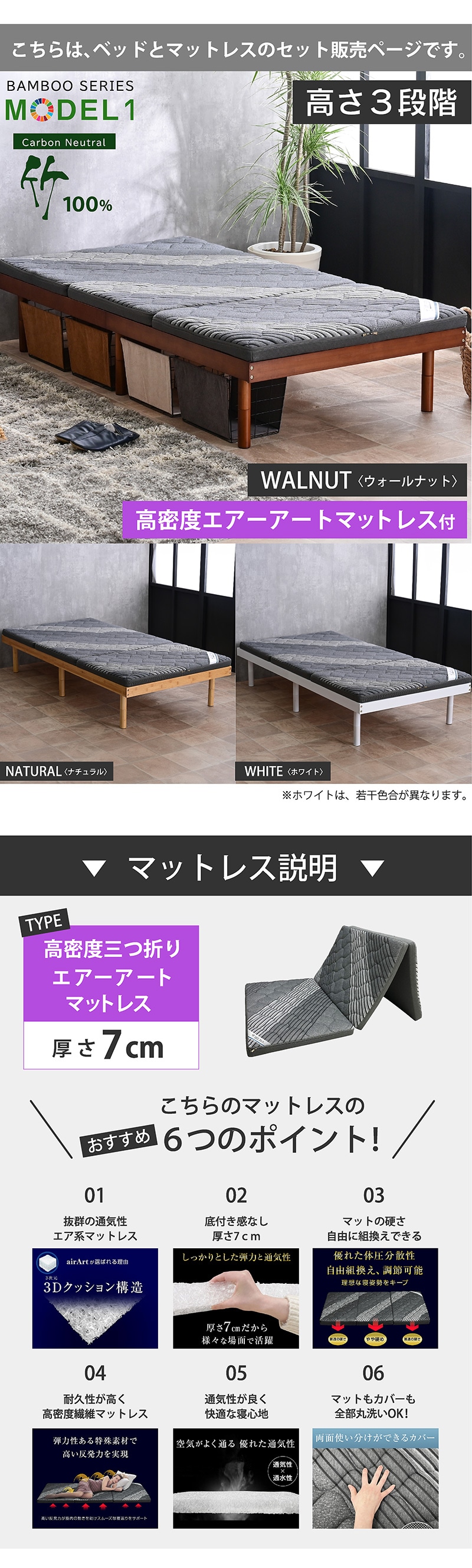 \木の約3倍以上強度がある竹100%使用!/ ・持続可能なカーボンニュートラル ・竹製すのこ床板は抗菌効果 ・手触り、肌触りがいいウレタン塗装を採用 ・安心・安全のホルムアルデヒド濃度 ・耐久性に優れた極厚10mmスノコ ・縦方向の桟板を追加して強度アップ ・桟板にフェルトを追加して軋み音をカット ・3段階高さ調整(ロースタイル、ミドルスタイル、ハイスタイル) ・脚の裏には傷防止フェルト付き ・シングル2台を並べてキングサイズにできる |