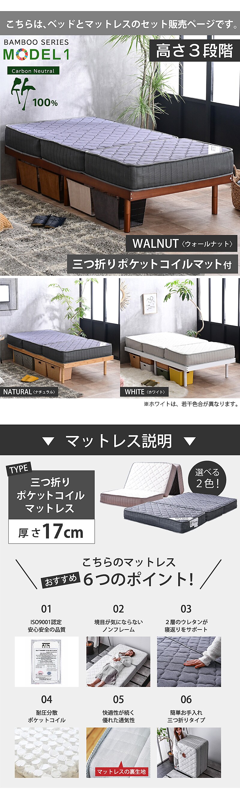 ベッド ベッドフレーム シングルベッド 最安値挑戦 天然木 竹 すのこベッド ローベッド 竹製 エコ素材 3段階高さ調節 モデル1 / ベッド:ウォールナット / マットレス:グレー / (圧縮ポケットマット付) -ART