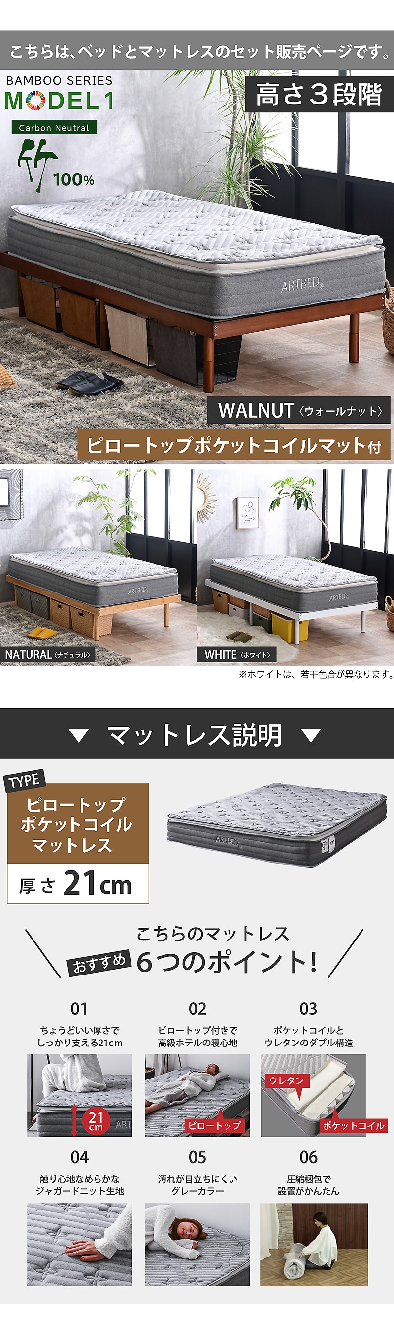 天然木竹 ベッド ベッドフレーム 最安値挑戦 ダブルベッド すのこベッド ローベッド ベッド 3段階高さ調節 モデル1 / ウォールナット / (ピロートップポケットマット付) -ART