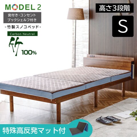 ベッド ベッドフレーム シングルベッド 天然木 竹製 最安値に挑戦 宮棚 コンセント 収納棚 2段階高さ調節 耐荷重300kg 頑丈 モデル2 / ウォールナット / (特殊高反発三つ折りマット付) -ART
