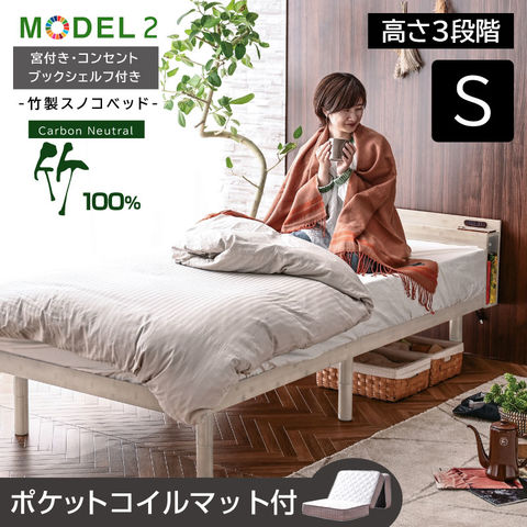 ベッド ベッドフレーム シングルベッド 天然木 竹製 最安値に挑戦 宮棚 コンセント 収納棚 2段階高さ調節 耐荷重300kg 頑丈 モデル2 / ベッド:ホワイトウォッシュ / マットレス:ホワイト / (圧縮ポケットマット付) -ART