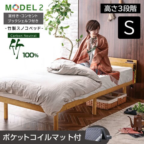 ベッド ベッドフレーム シングルベッド 天然木 竹製 最安値に挑戦 宮棚 コンセント 収納棚 2段階高さ調節 耐荷重300kg 頑丈 モデル2 / ベッド:ナチュラル / マットレス:グレー / (圧縮ポケットマット付) -ART