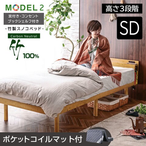宮棚 コンセント 収納棚 最安値に挑戦 ベッド セミダブル フレーム2段階高さ調節 耐荷重300kg 頑丈 天然木 竹製 北欧 おしゃれ モデル2 / ベッド:ナチュラル / マットレス:グレー / (圧縮ポケットマット付) -ART