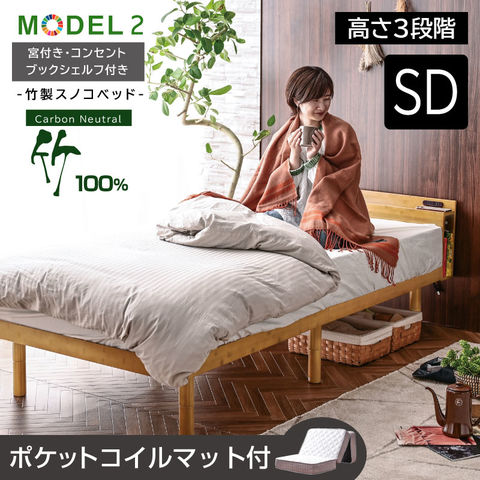 宮棚 コンセント 収納棚 最安値に挑戦 ベッド セミダブル フレーム2段階高さ調節 耐荷重300kg 頑丈 天然木 竹製 北欧 おしゃれ モデル2 / ベッド:ナチュラル / マットレス:ホワイト / (圧縮ポケットマット付) -ART