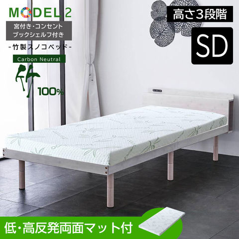 宮棚 コンセント 収納棚 最安値に挑戦 ベッド セミダブル フレーム2段階高さ調節 耐荷重300kg 頑丈 天然木 竹製 北欧 おしゃれ モデル2 / ホワイトウォッシュ / (低反発 高反発 両面マット付) -ART