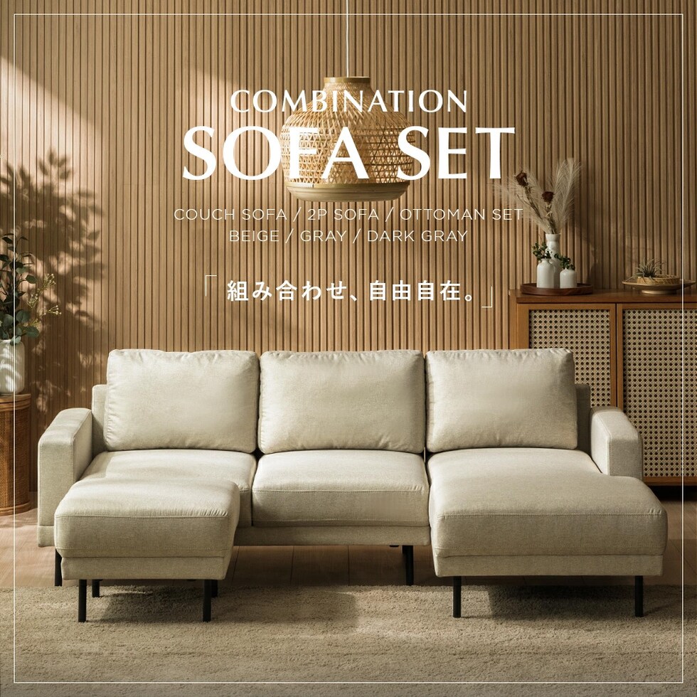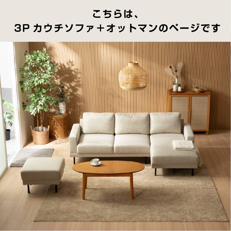 | 梱包サイズ | ・カウチソファ 2P:横幅133×奥行き80×高さ46cm カウチ:横幅73×奥行き133×高さ46cm ・2Pソファ 横幅131×奥行き78×高さ73cm ・オットマン 横幅55×奥行き55×高さ40cm |