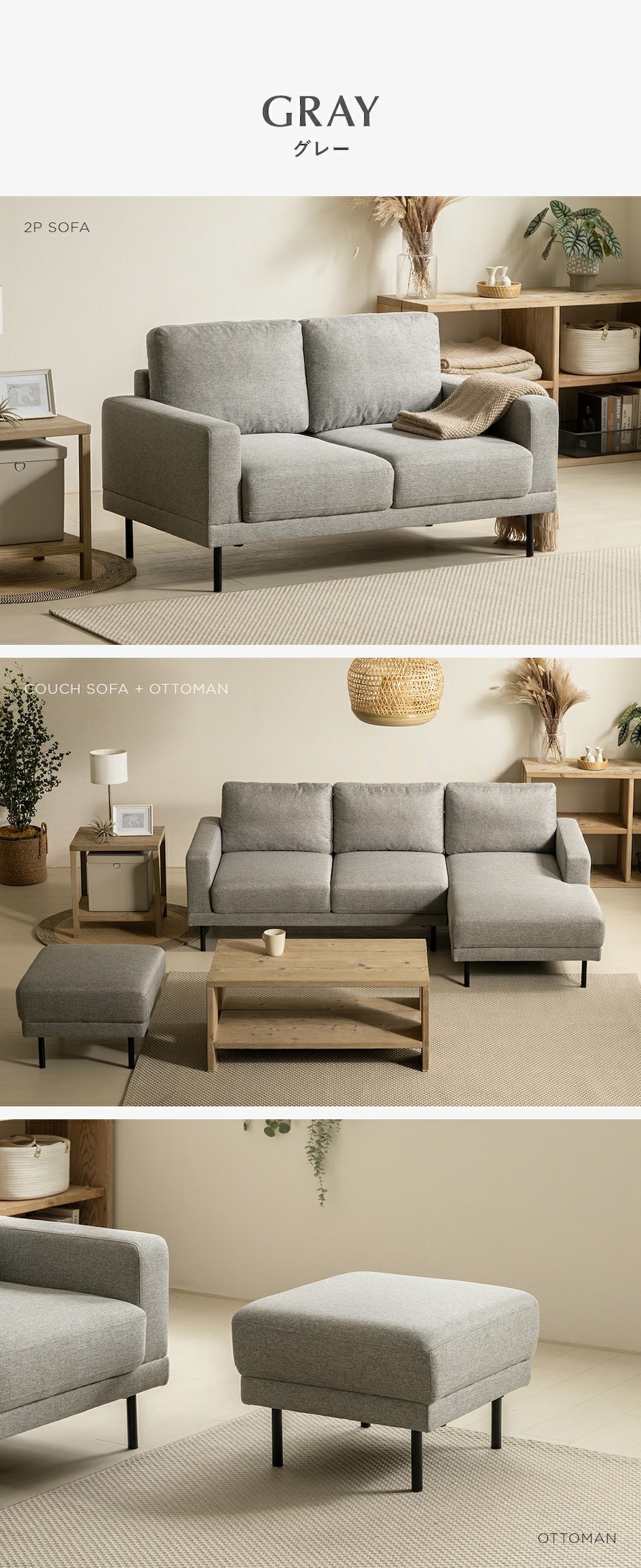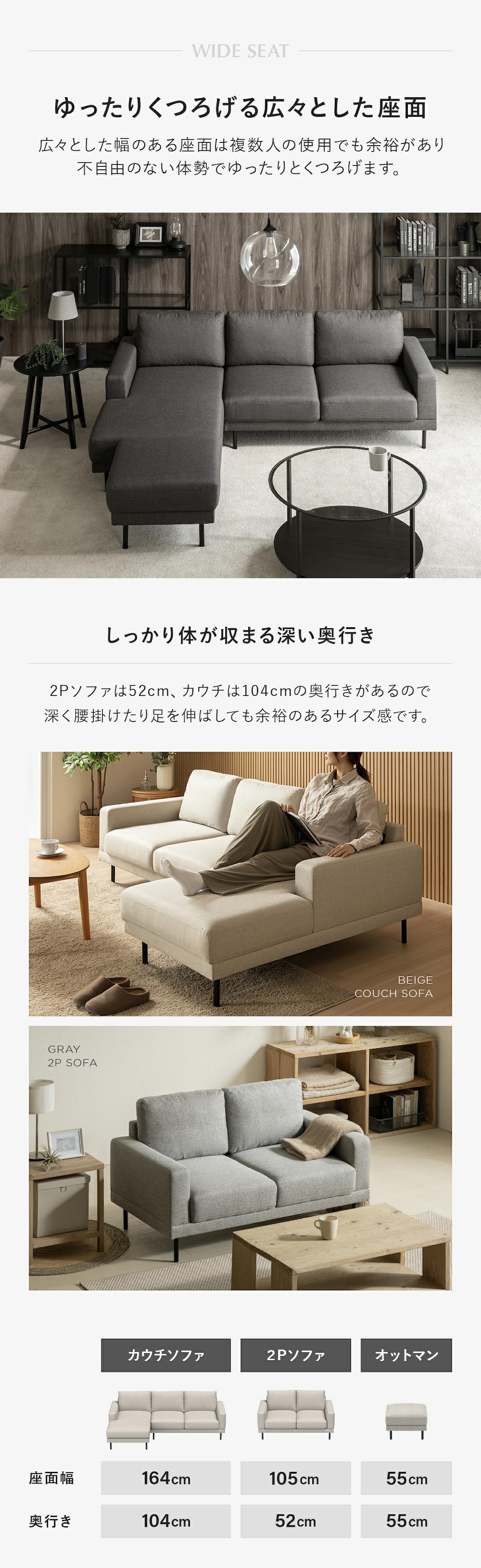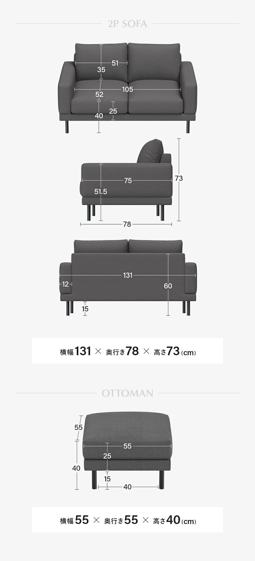 | サイズ | カウチソファ:横幅202.5×奥行き131.5×高さ73cm 2Pソファ:横幅131×奥行き78×高さ73cm オットマン:横幅55×奥行き55×高さ40cm |