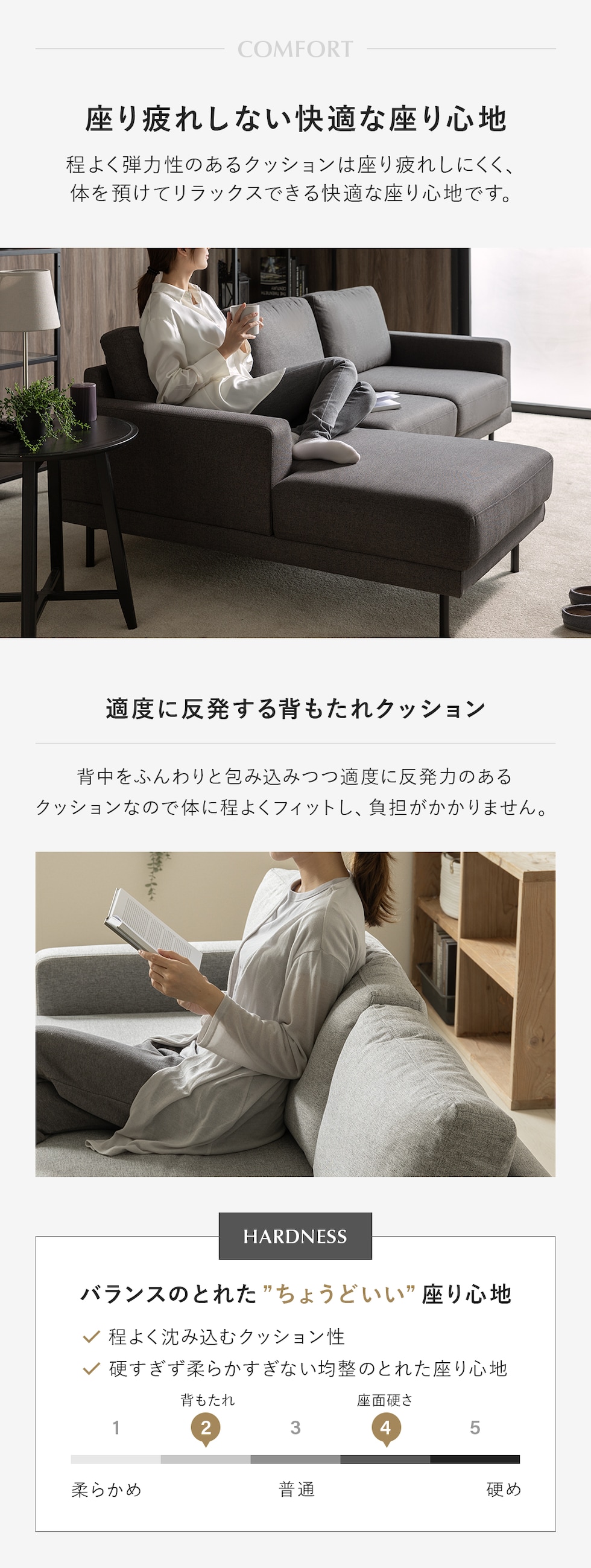 ・シンプルでタイムレスなデザイン ・選べる自由なバリエーション ・汚れに強い撥水加工生地 ・広々としたワイドな座面 ・バランスのいい座り心地 ・スリムなシルエットの鉄脚 ・ローソファとしても使える ・安心の高耐荷重設計 ・着脱式の背面クッション |