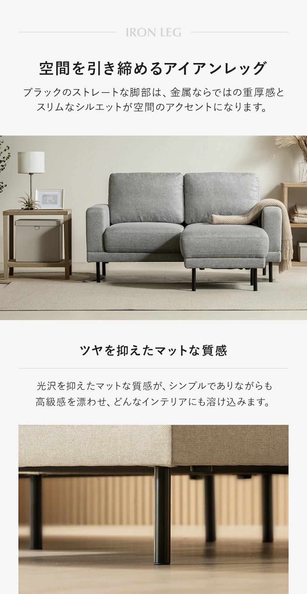 ・天然木 ・ポリエステル ・ウェービングテープ ・Sバネ ・ウレタンフォーム ・チップウレタン ・フェザー ・アイアン脚 |