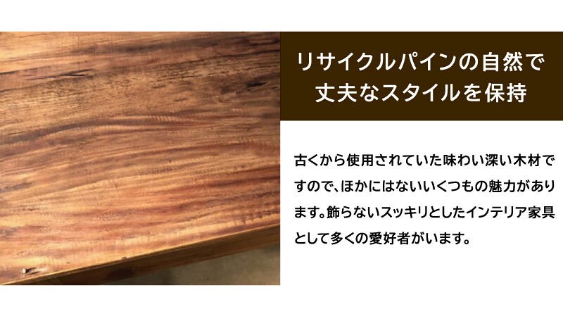 【完成品】※脚の取り付けのみ ・リサイクルパインの自然で丈夫なスタイルを保持し、現代に合う要素を取り入れました。 ・デザインはシンプルさを追及し、実用的なライフスタイルに合わせています。 ・直線的にカットされた無垢材は使いやすく、自然とお部屋に馴染みます。 ・長く使われた素材を再利用することで、現代生活に癒しの空間を演出します。 ・ショップなどのディスプレイ用としても最適です。 |