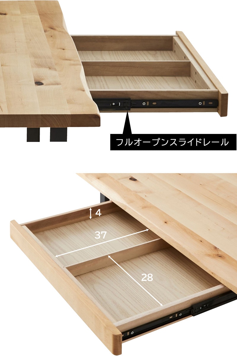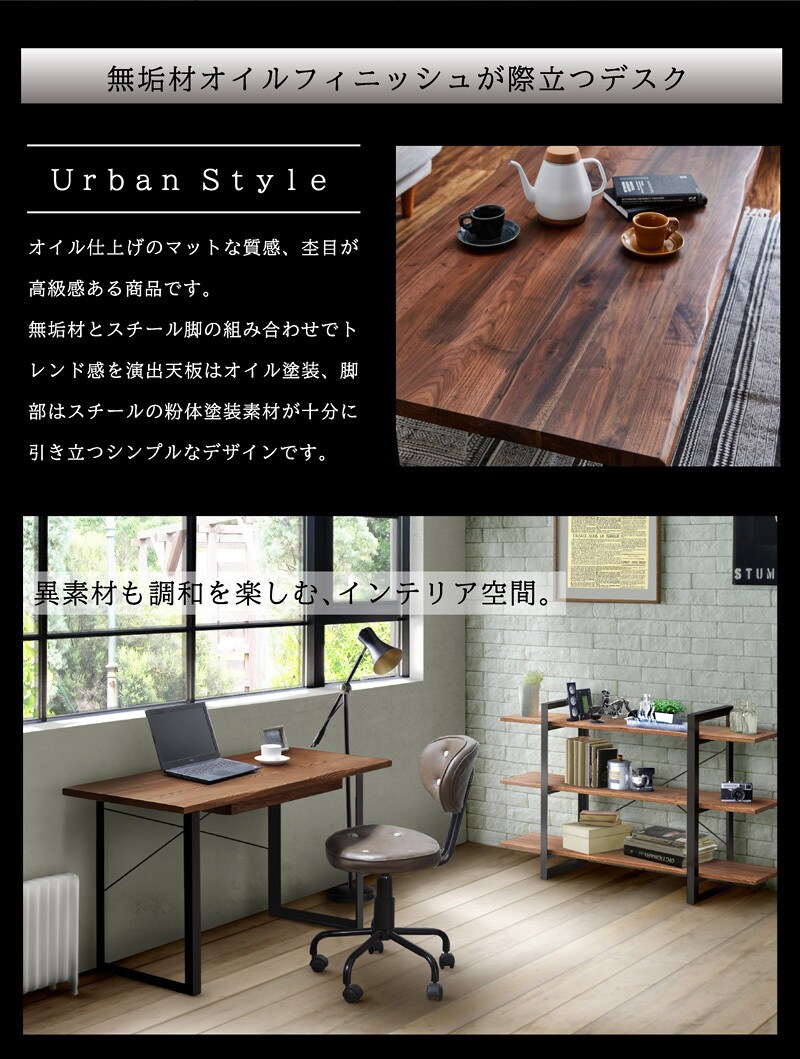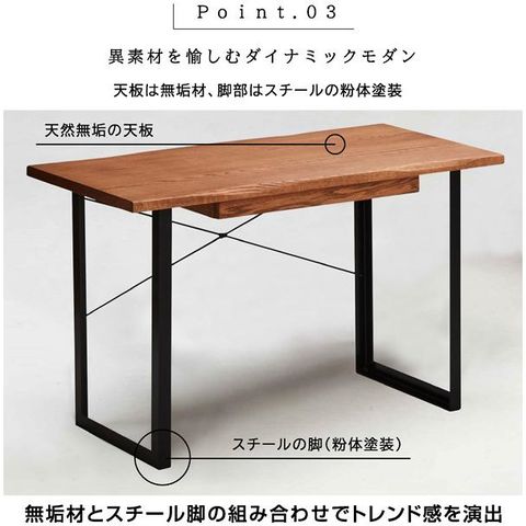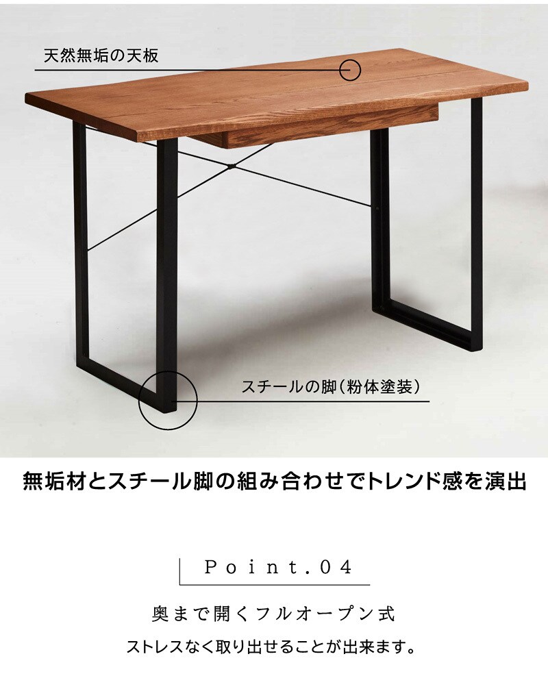 | 特徴 | 無垢材オイルフィニッシュの引き出し付きデスクです。 オイル仕上げのマットな質感、杢目が高級感ある商品です。 無垢材とスチール脚の組み合わせでトレンド感を演出 脚部はスチールの粉体塗装 天板縁部は躍動感あるナグリ加工、引き出し付き(フルスライドレール) |