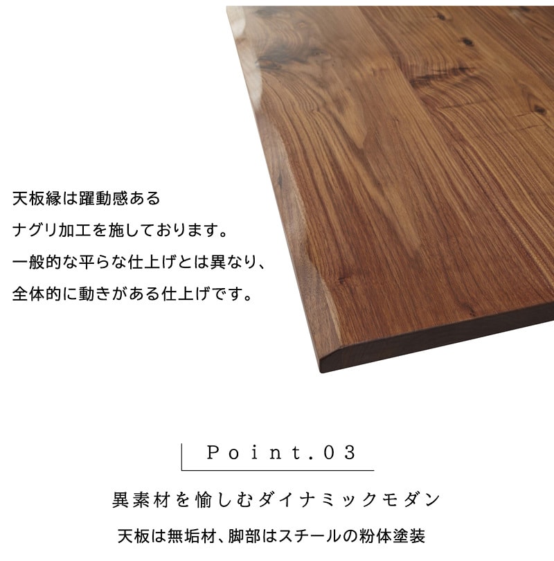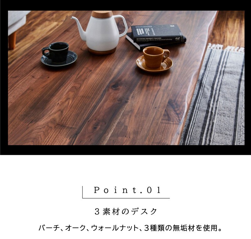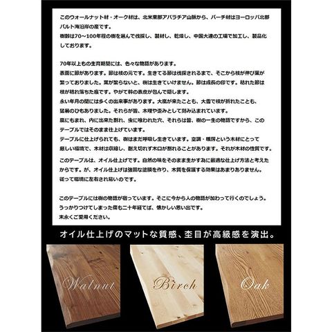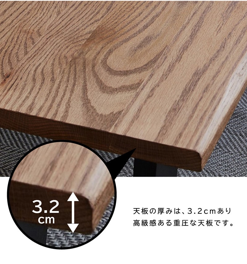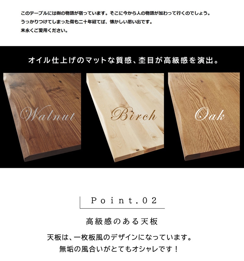 | 素材 | 天板:オーク無垢 脚部:スチール 天板:ウォールナット無垢 脚部:スチール 天板:バーチ無垢 脚部:スチール |