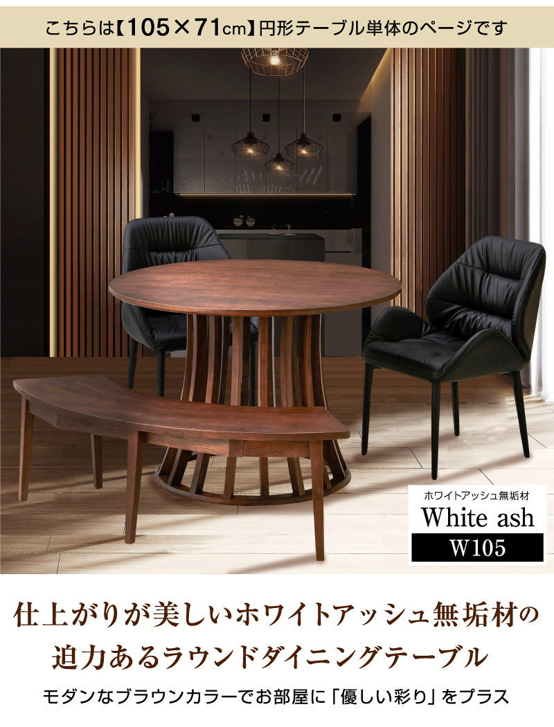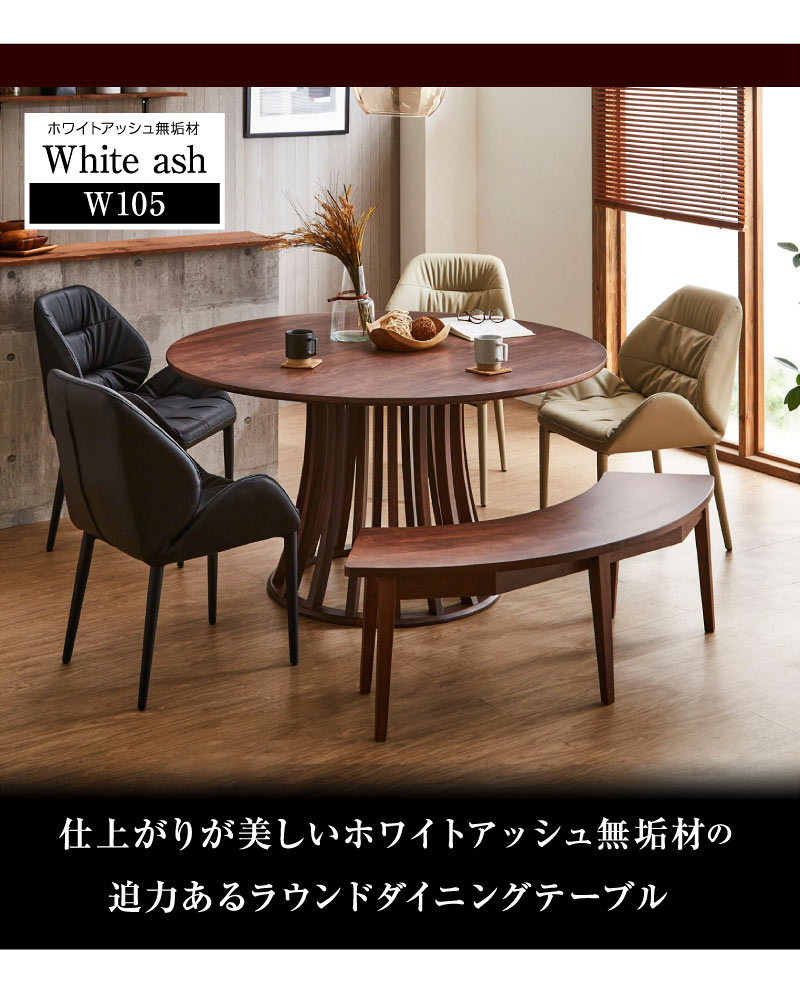 | 特徴 | 【組立品(大人2名で約20分)】天板に脚を取り付けます。脚は完成品でお届け ・躍動感ある杢目がきれいなホワイトアッシュ無垢材を使用したラウンドダイニング ・特徴的な脚部デザインは個性的で高級感ある仕上げとなってます ・天板サイズは直径105cm。お部屋に合わせやすいサイズ ・角がないため小さなお子様がいるご家庭でも安心して使える設計 ・ウレタン塗装で仕上げた天板は水分や熱に強く、反りやひび割れが起こりにくいのが特長。綺麗な状態を長い間楽しめます ※チェア・ベンチは別売りです。 |