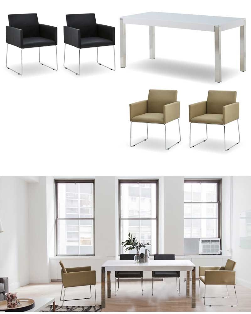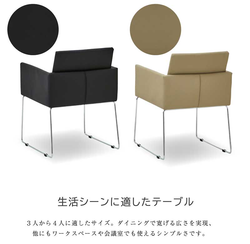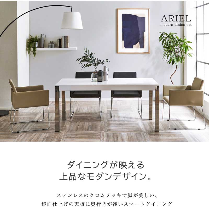 | 特徴 | ・ボックス型の肘付きチェアをセットしたシャープなデザインのモダンダイニングセットです。 ・テーブルはホワイト鏡面仕上げ ・奥行きを浅くデザインしており、スレンダーな印象を与えます。 ・脚部はステンレスの鏡面仕上げで清潔感があります。 ・肘付きのボックス型チェアは並べて待合室などやミーティング用としてもご使用いただけます。 ・PU張りでシックなブラックとコーディネートしやすいベージュの2色対応 |