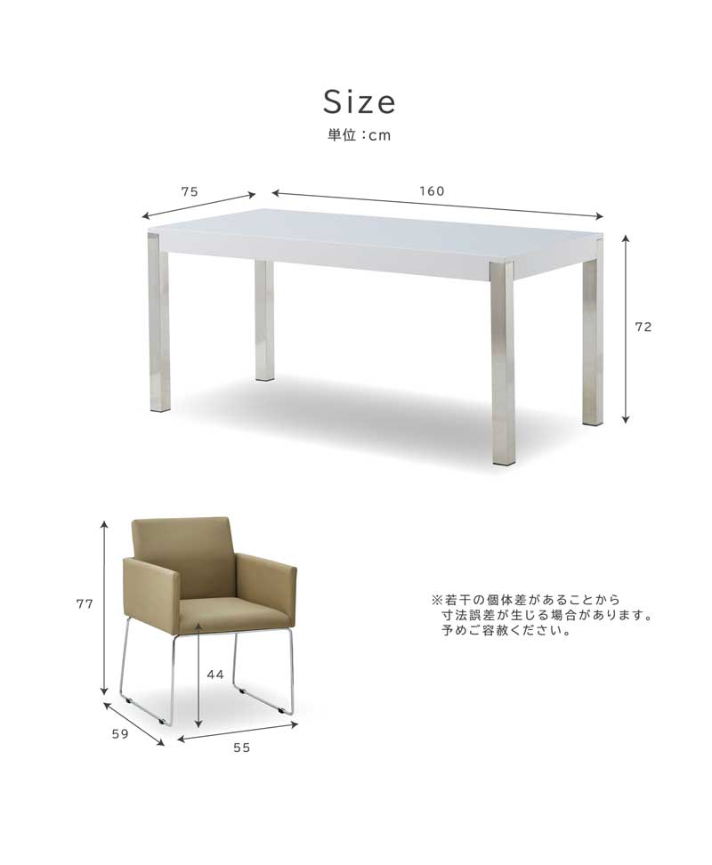 | サイズ(cm) | テーブル:幅160×高さ72×奥行75 チェア:幅55×高さ77×奥行59(座面高さ44) |