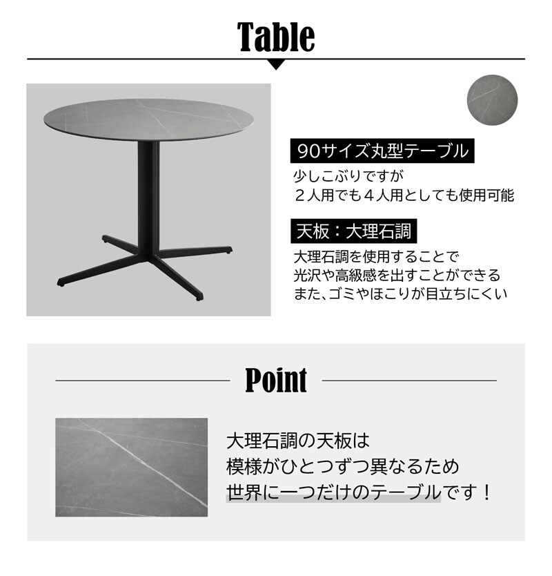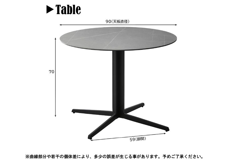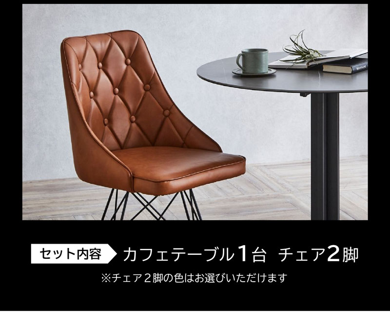| サイズ | テーブル:幅90x奥行き90x高さ70(cm) チェア:幅48x奥行き56x高さ82(cm) |