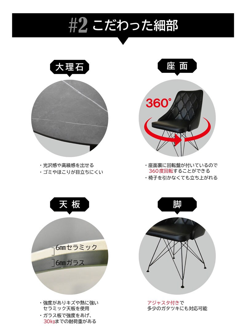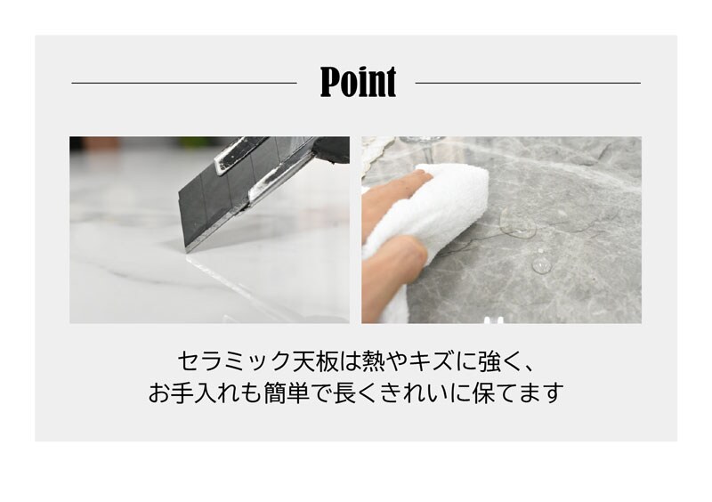 | 材質(テーブル) | 天板:6mmセラミック+6mmガラス 脚部:スチール |