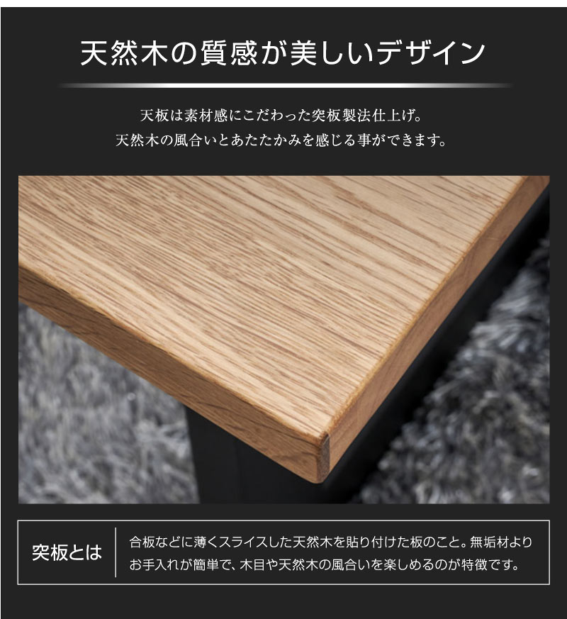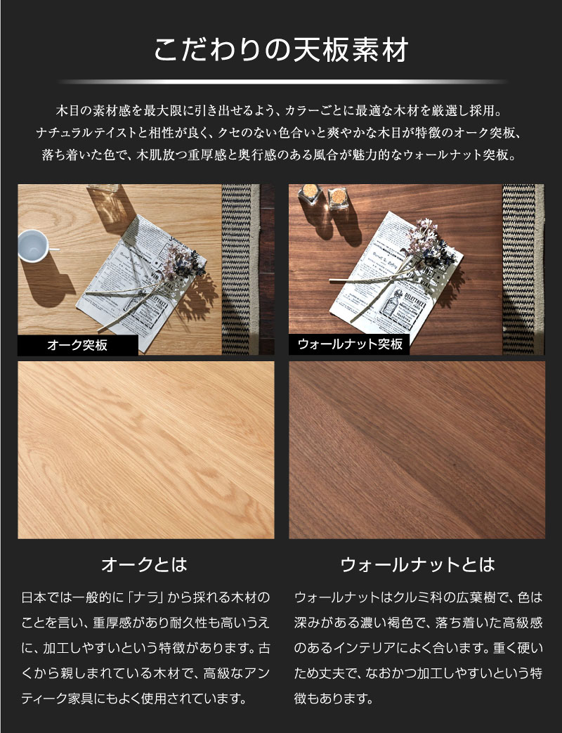 天板:ウォールナット突板(ブラウン)/オーク突板(ナチュラル) 脚:ラバーウッド無垢集合材 |